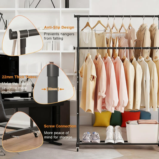 Double-Tier Heavy-Duty Rolling Clothes Rack with Bottom Storage