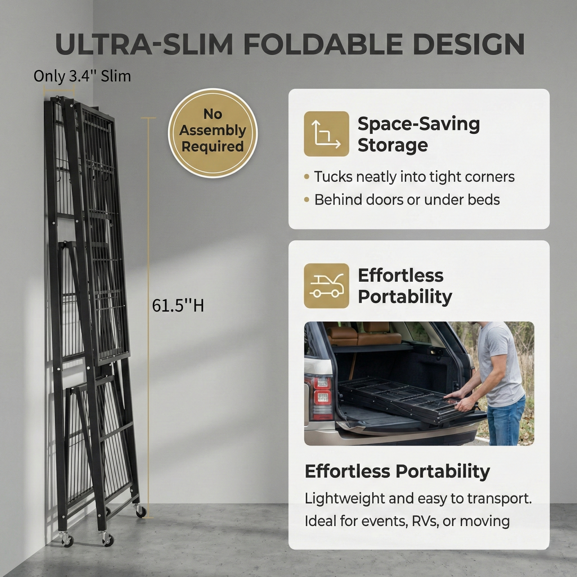 360° mobility meets industrial strength. Collapses to just 3 inches wide for easy storage behind doors or in closets.