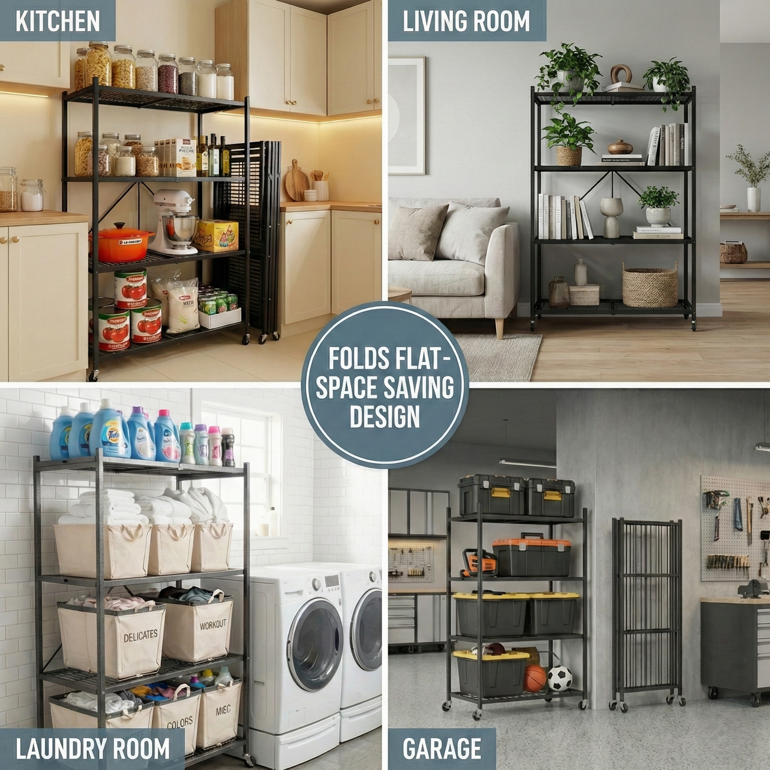 LineaHome 4-Tier Foldable Rolling Storage Rack - 1000 LBS Capacity Heavy Duty Steel Shelving Unit