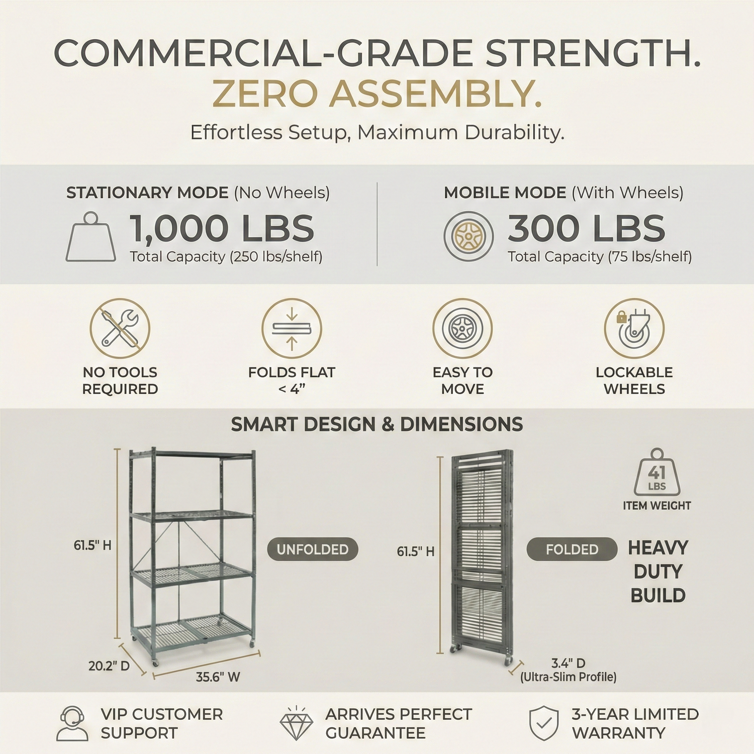 100% pre-assembled design-just unfold in seconds. Supports 250 lbs per shelf, making it the fastest way to organize yourgarage or pantry.
